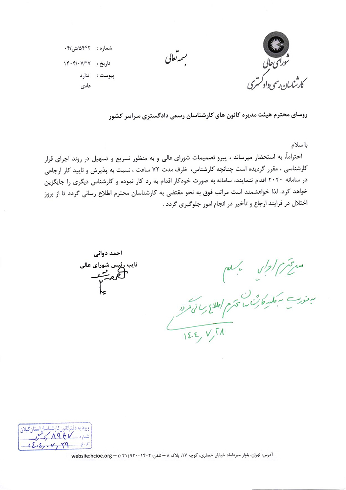 نامه شماره 5442-ش-04 شورای عالی درخصوص تأیید یا رد کار اجرایی در سامانه 2020 ظرف مدت 72 ساعت