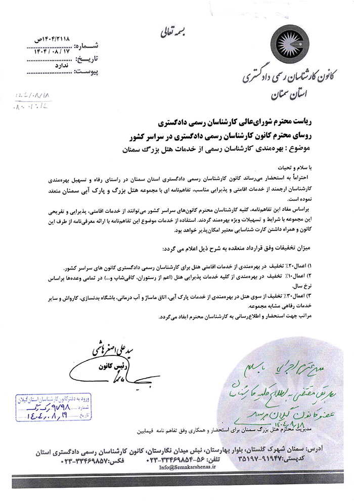 نامه کانون کارشناسان رسمی دادگستری استان سمنان در خصوص بهره مندی کارشناسان رسمی دادگستری سراسر کشور از خدمات هتل بزرگ سمنان